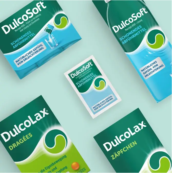 Entdecke hier die vollständige DulcoLax Produkt Familie: Dragées, Zäpfchen, Tropfen sowie DulcoSoft Lösung und Pulver..