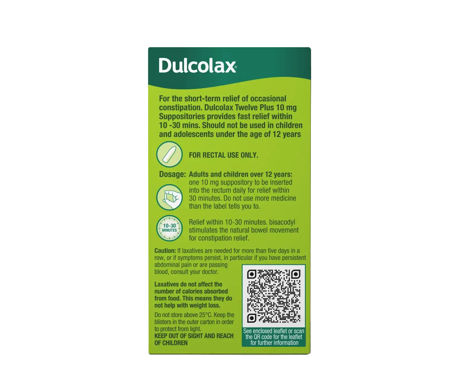 DulcoLax® Twelve plus Suppositories act directly in the rectum, providing predictable relief at the source stimulating your natural gut rhythm to soften the stools.